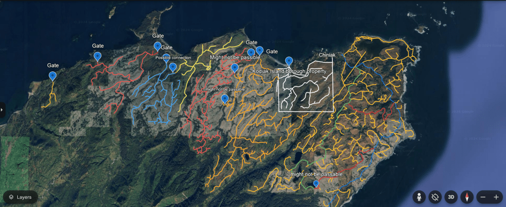 Below is a map of the logging roads in Chiniak that I have been working on. I will update here when it is done.